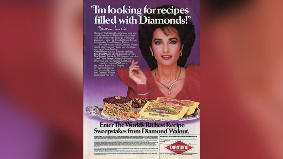 It’s 1985. You’re a walnut brand looking to imbue your grocery-store products with an aura of impossible glamour. What do you do? Obviously, you hire All My Children mainstay and living legend Susan Lucci to host a “World’s Richest Recipe” contest.