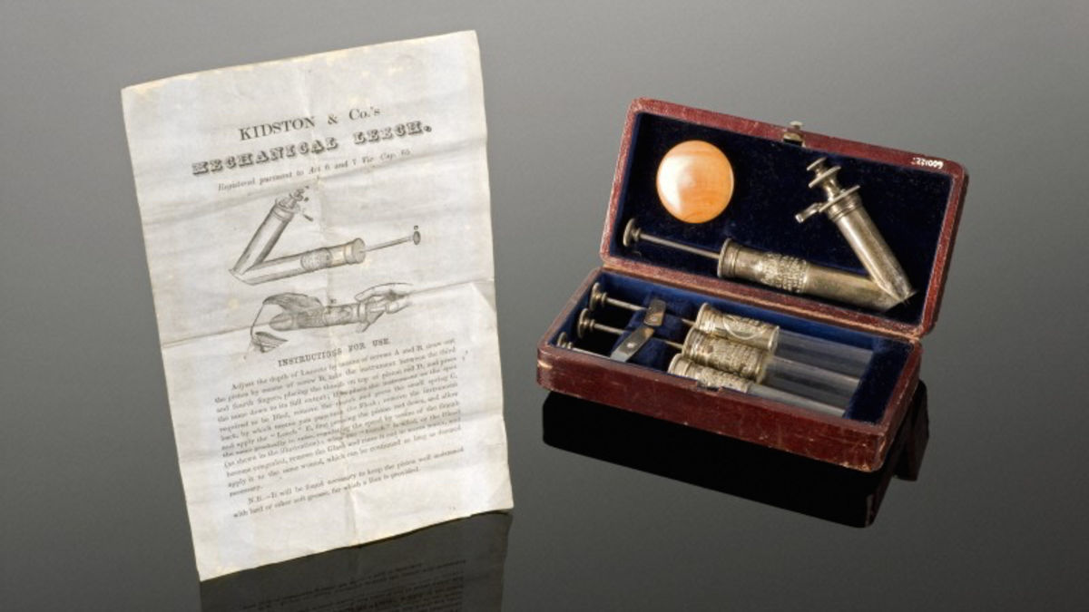 One attempt at an artificial leech was created by Dr. Baron Charles Louis Heurteloup. Phisick Medical Antiques describes the object as such: